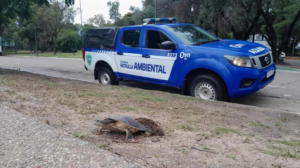 Recientemente, en calle Pública esq. del Parque de Bº Parque Sarmiento, se procedió a perimetrar el sector donde se encontraba un ejemplar de tortuga acuática desovando. El suceso, ocurrió en inmediaciones de la laguna del parque, donde personal de la División Patrulla Ambiental, luego de un llamado al 911 por parte de la Guardia Urbana, se constituyó en el lugar delimitando el lugar para preservar la especie protegida por la Ley Nacional Nº 22421 (fauna silvestre).