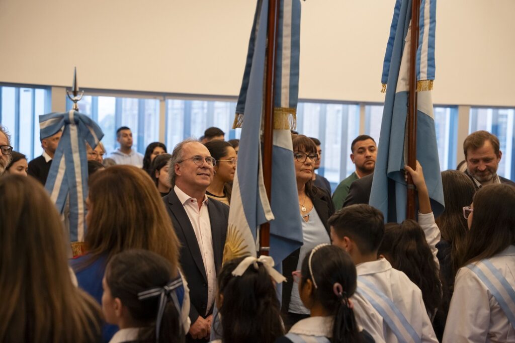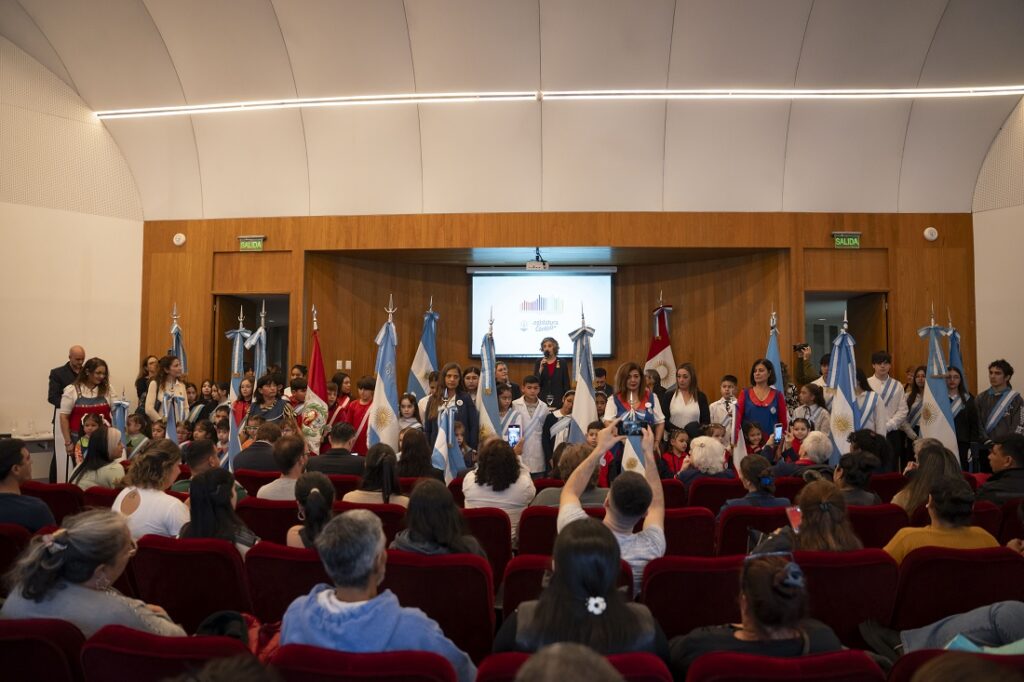 Tras entonar el Himno Nacional Argentino, los estudiantes escucharon los discursos desde las butacas. Luego de las palabras de las autoridades, se entregaron banderas de la paz a las escuelas y la cantante Cristina Oliva ofreció un número musical. Interpretó “Canción con todos” y, de esta manera, finalizó el encuentro.