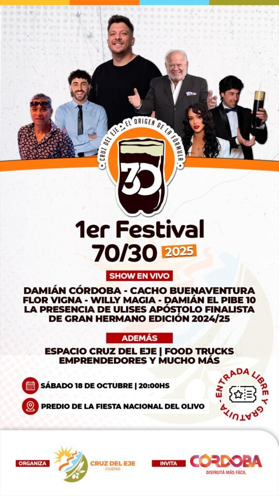 La Municipalidad de Cruz del Eje organiza la primera fiesta que tiene como eje temático el fernet con coca. Se trata del Primer Festival 70/30 que tendrá lugar el sábado 18 de octubre en el Predio de la Fiesta Nacional del Olivo y con entrada libre y gratuita.