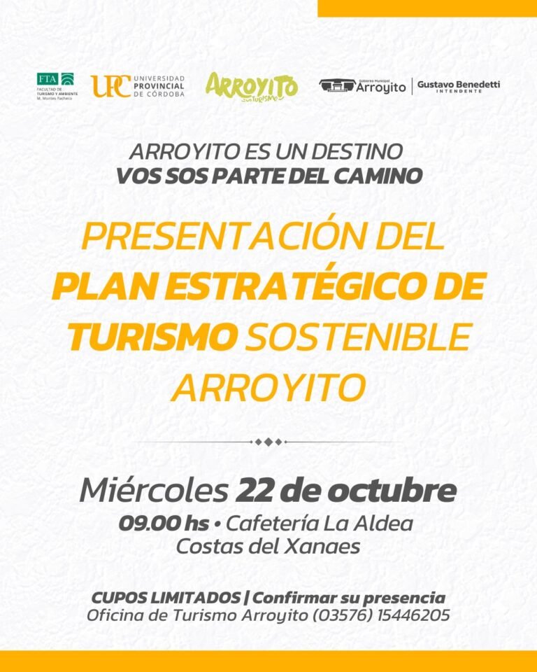 El Gobierno Municipal invita a participar de la presentación del Plan Estratégico de Turismo Sostenible de Arroyito, una herramienta clave que orientará el desarrollo turístico de la ciudad en los próximos años.